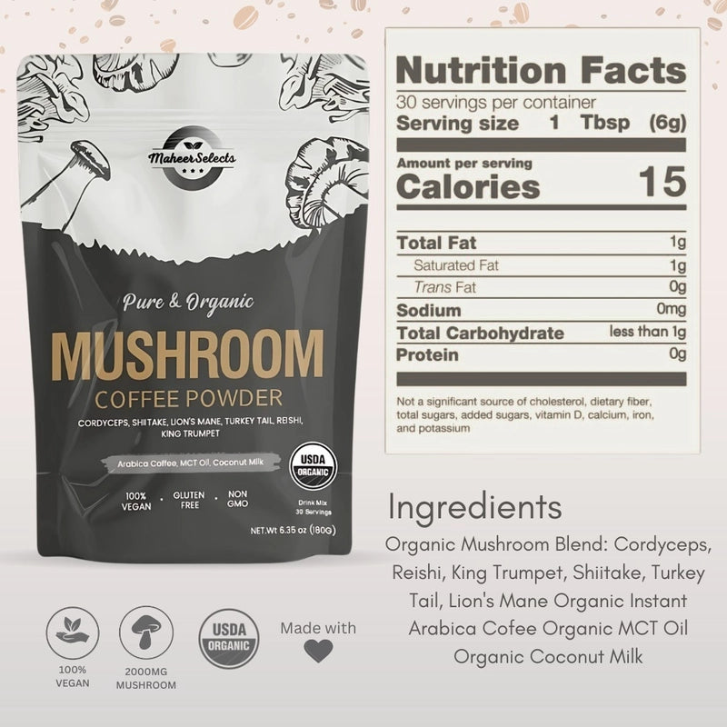 Experience smooth, sustained energy and laser focus with Maheer Selects mushroom coffee. Made with 6 adaptogenic mushrooms, it's your delicious secret to a better day, every day. USDA Organic certified.